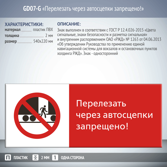 Знак «Перелезать через автосцепки запрещено!», GD07-G (односторонний горизонтальный, 540х220 мм, пластик 2 мм) в Верее купить