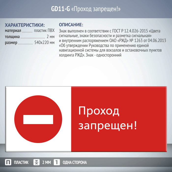 Знак «Проход запрещен!», GD11-G (односторонний горизонтальный, 540х220 мм, пластик 2 мм) в Верее купить