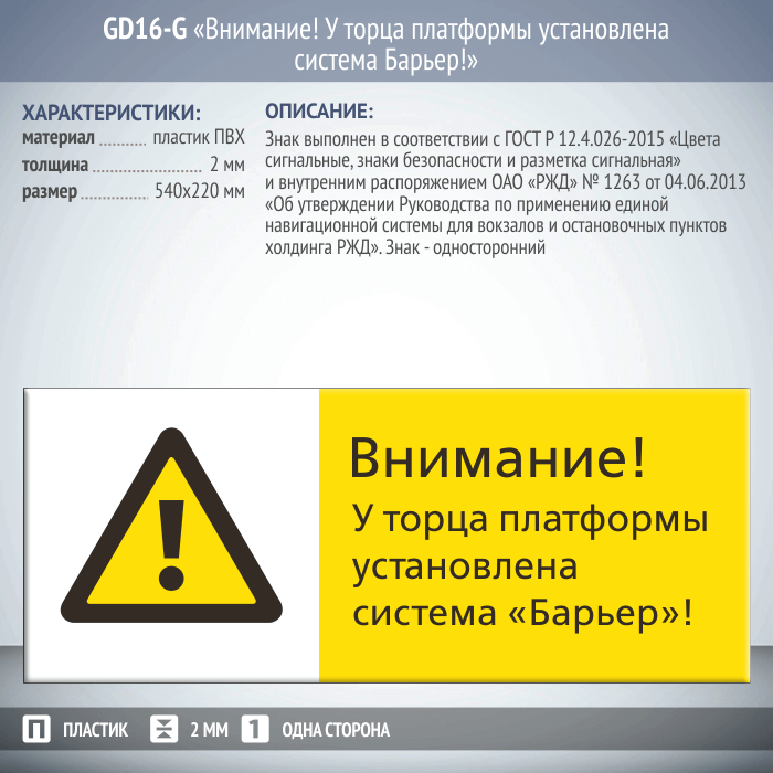 Знак «Внимание! У торца платформы установлена система Барьер!», GD16-G (односторонний горизонтальный, 540х220 мм, пластик 2 мм) в Верее купить