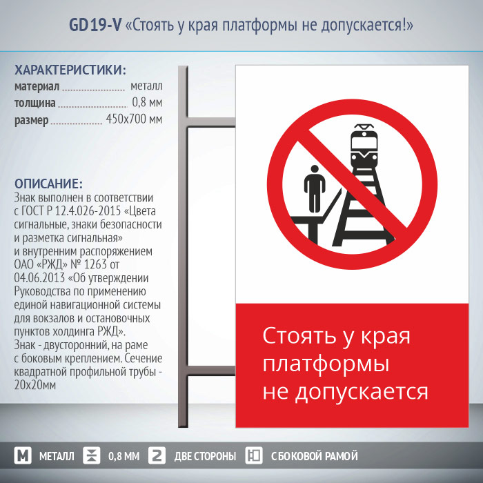 Знак «Стоять у края платформы не допускается!», GD19-V (двусторонний вертикальный, 450х700 мм, металл, на раме с боковым креплением) в Верее купить