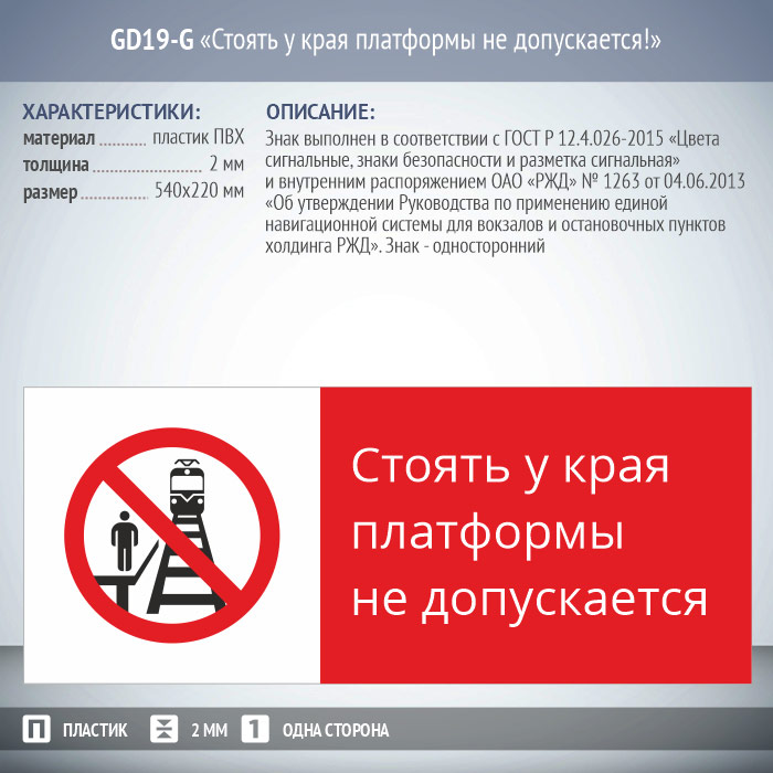Знак «Стоять у края платформы не допускается!», GD19-G (односторонний горизонтальный, 540х220 мм, пластик 2 мм) в Верее купить