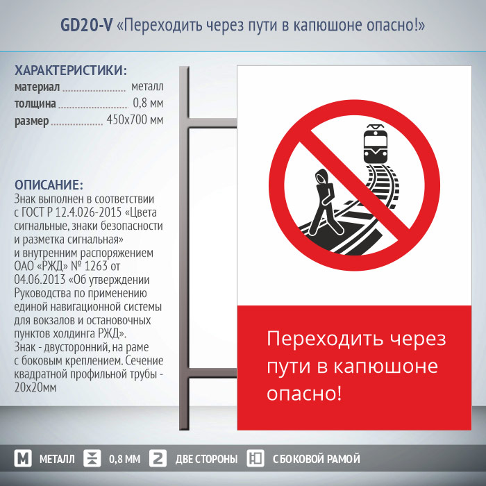 Знак «Переходить через пути в капюшоне опасно!», GD20-V (двусторонний вертикальный, 450х700 мм, металл, на раме с боковым креплением) в Верее купить