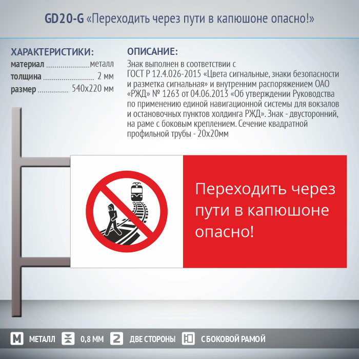 Знак «Переходить через пути в капюшоне опасно!», GD20-G (двусторонний горизонтальный, 540х220 мм, металл, на раме с боковым креплением) в Верее купить