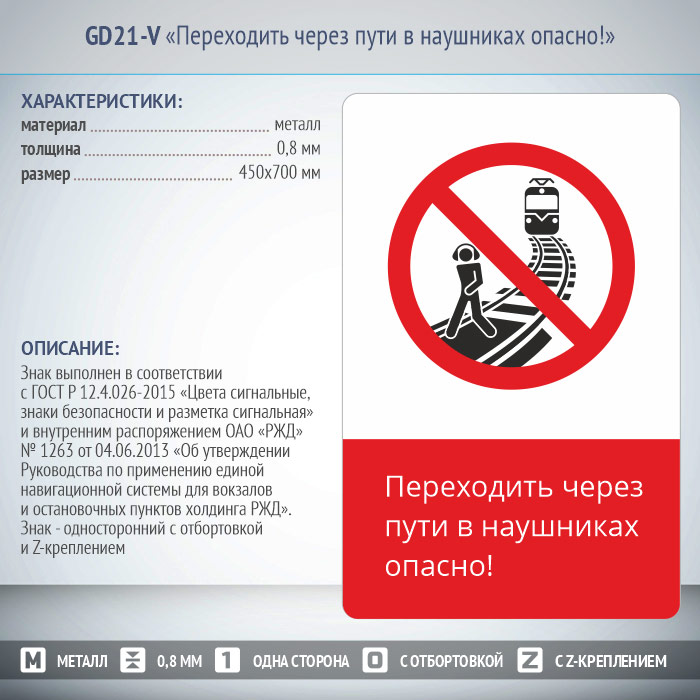 Знак «Переходить через пути в наушниках опасно!», GD21-V (односторонний вертикальный, 450х700 мм, металл, с отбортовкой и Z-креплением) в Верее купить