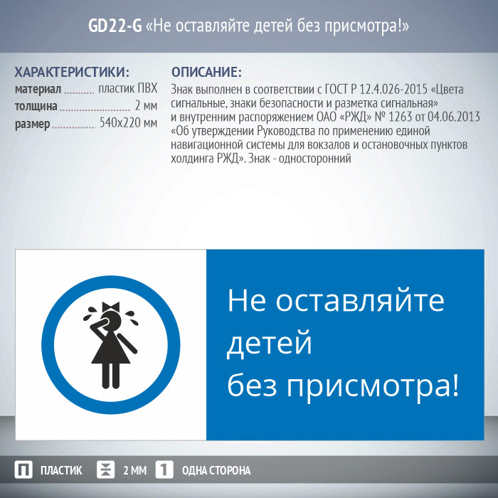 Знак «Не оставляйте детей без присмотра!», GD22-G (односторонний горизонтальный, 540х220 мм, пластик 2 мм) в Верее купить