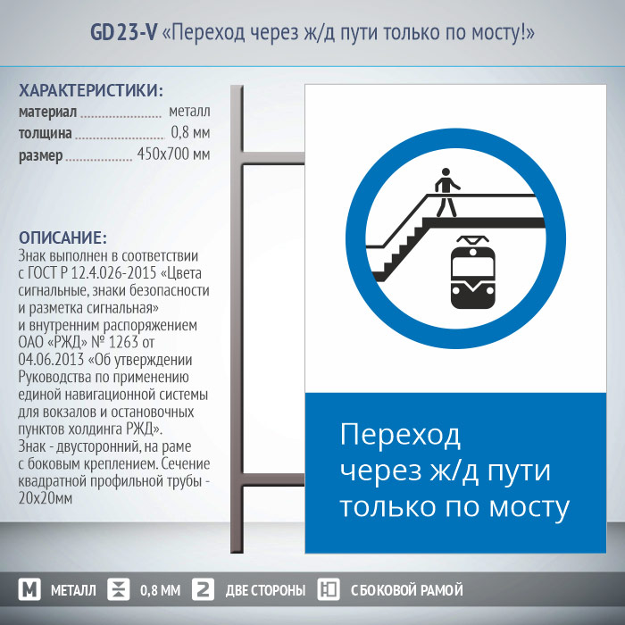 Знак «Переход через ж/д пути только по мосту!», GD23-V (двусторонний вертикальный, 450х700 мм, металл, на раме с боковым креплением) в Верее купить