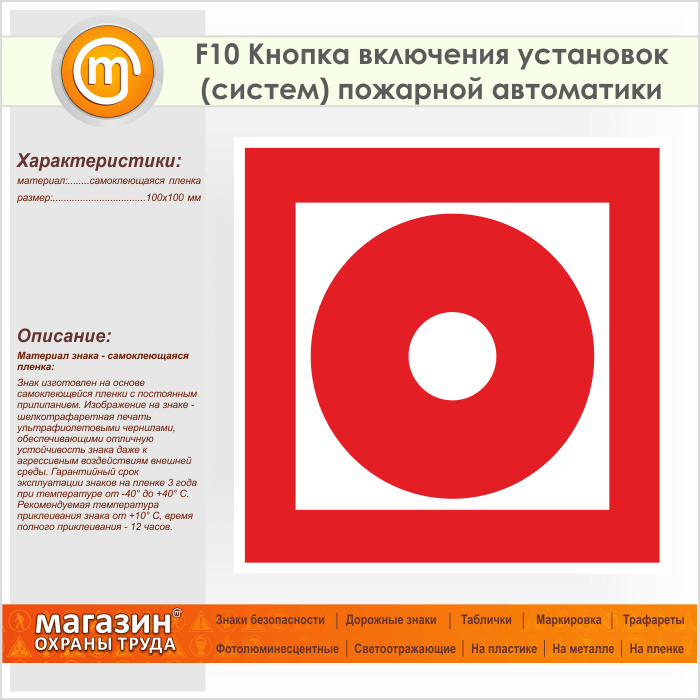 Знак F10 «Кнопка включения установок (систем) пожарной автоматики» (пленка, 100х100 мм) в Верее купить