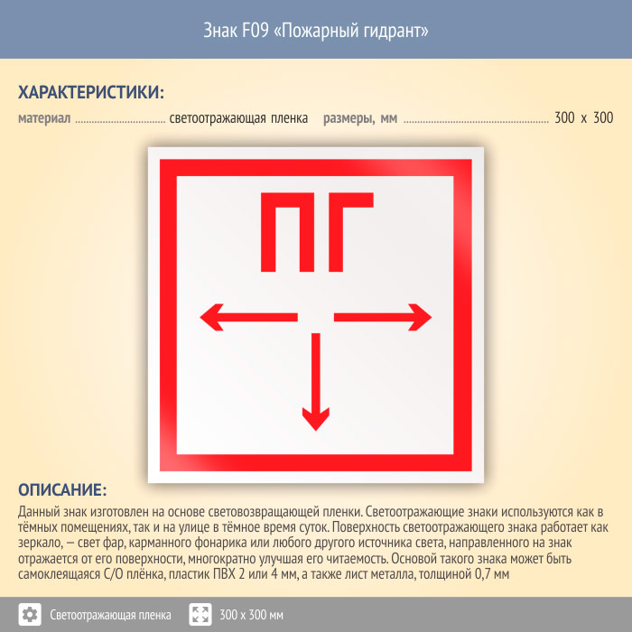Знак F09 «Пожарный гидрант» (светоотражающая пленка, 300х300 мм) в Верее купить