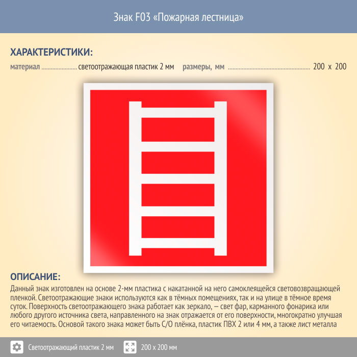 Знак F03 «Пожарная лестница» (светоотражающий пластик, 200х200 мм) в Верее купить