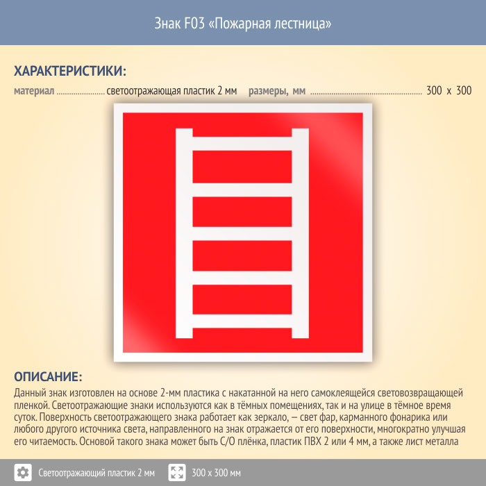 Знак F03 «Пожарная лестница» (светоотражающий пластик, 300х300 мм) в Верее купить