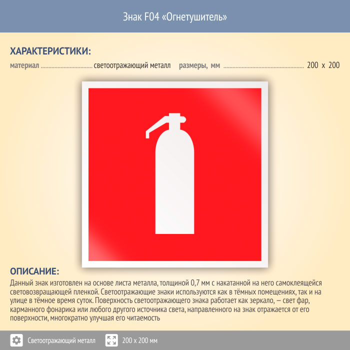 Знак F04 «Огнетушитель» (светоотражающий металл, 200х200 мм) в Верее купить
