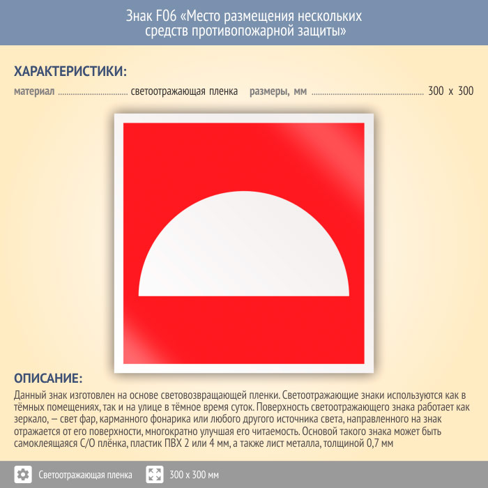 Знак F06 «Место размещения нескольких средств противопожарной защиты» (светоотражающая пленка, 300х300 мм) в Верее купить