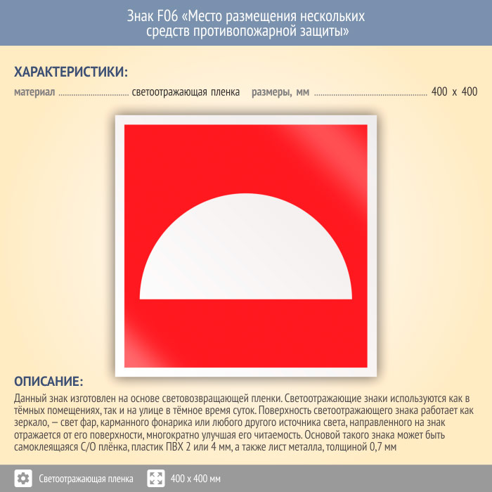 Знак F06 «Место размещения нескольких средств противопожарной защиты» (светоотражающая пленка, 400х400 мм) в Верее купить