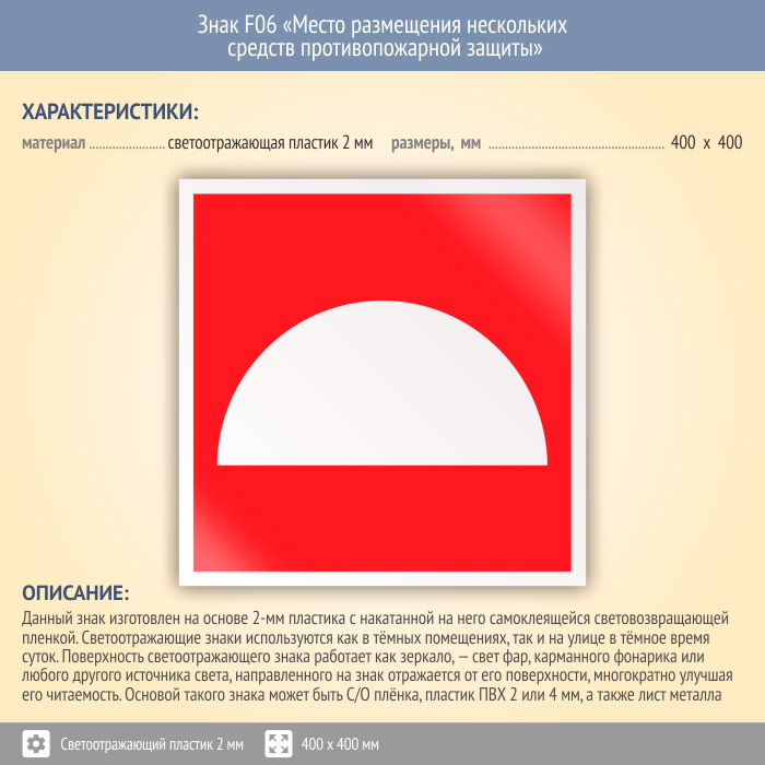 Знак F06 «Место размещения нескольких средств противопожарной защиты» (светоотражающий пластик, 400х400 мм) в Верее купить