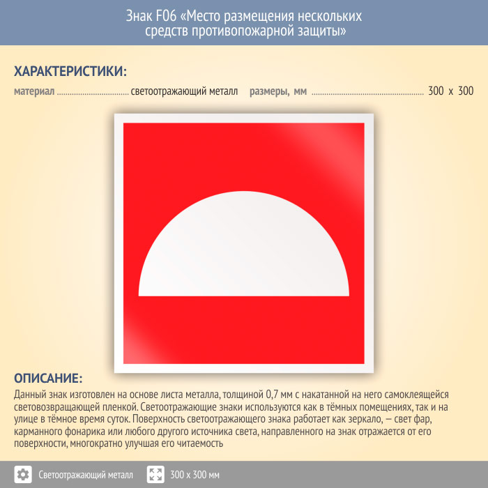 Знак F06 «Место размещения нескольких средств противопожарной защиты» (светоотражающий металл, 300х300 мм) в Верее купить