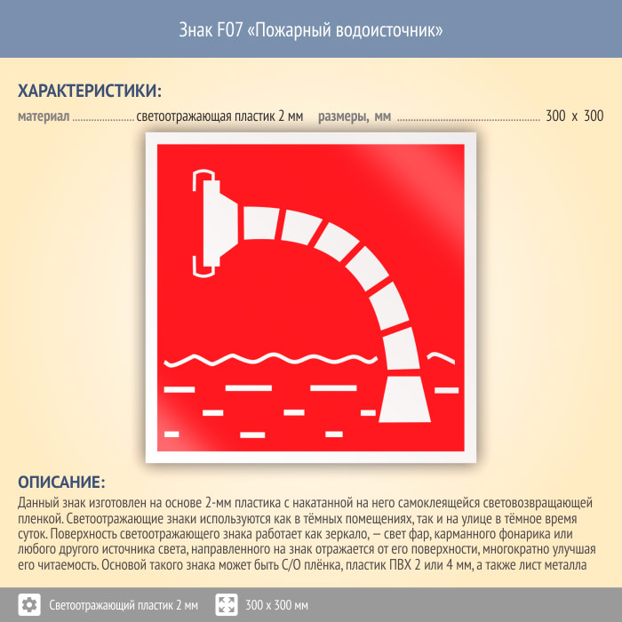 Знак F07 «Пожарный водоисточник» (светоотражающий пластик, 300х300 мм) в Верее купить