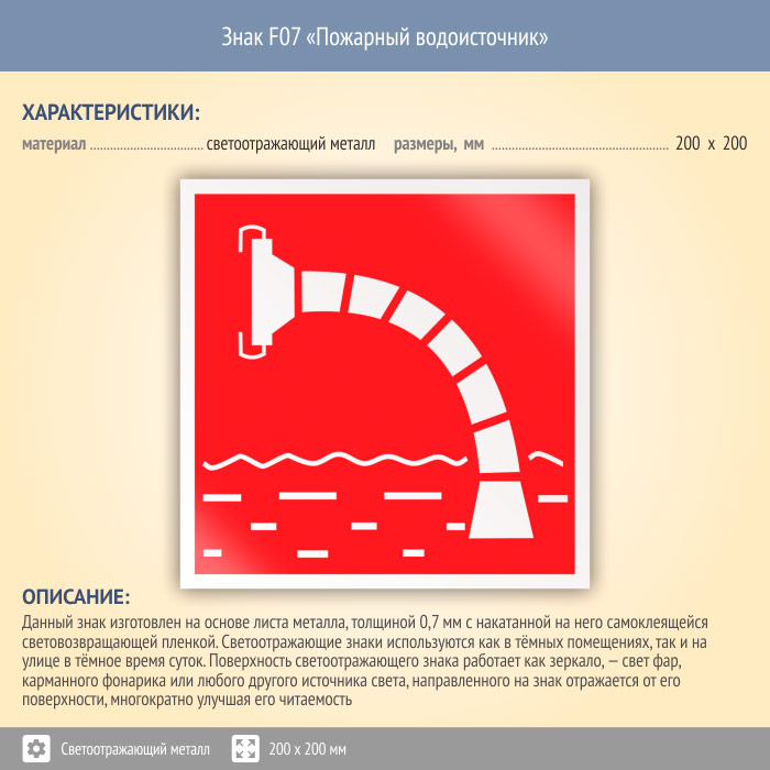 Знак F07 «Пожарный водоисточник» (светоотражающий металл, 200х200 мм) в Верее купить