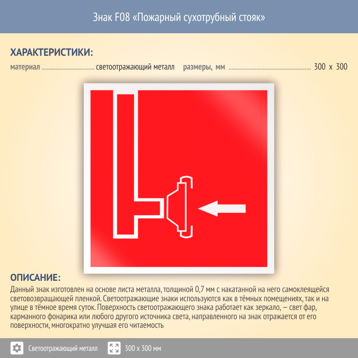 Знак F08 «Пожарный сухотрубный стояк» (светоотражающий металл, 300х300 мм) в Верее купить