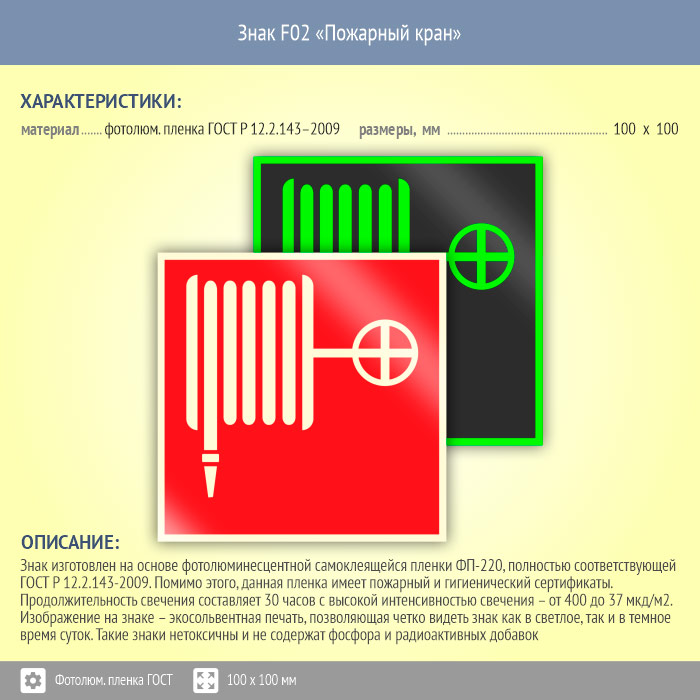 Знак F02 «Пожарный кран» (фотолюминесцентная пленка ГОСТ 34428-2018, 100х100 мм) в Верее купить