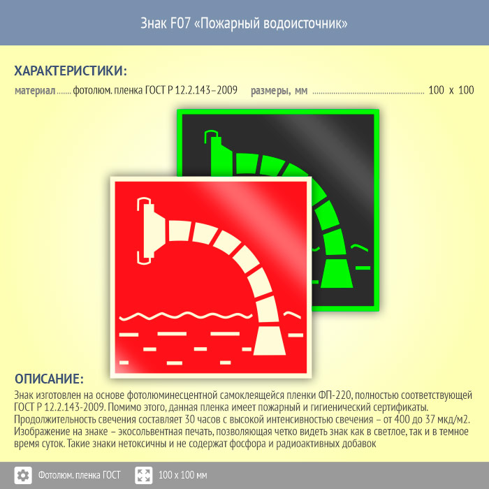 Знак F07 «Пожарный водоисточник» (фотолюминесцентная пленка ГОСТ 34428-2018, 100х100 мм) в Верее купить