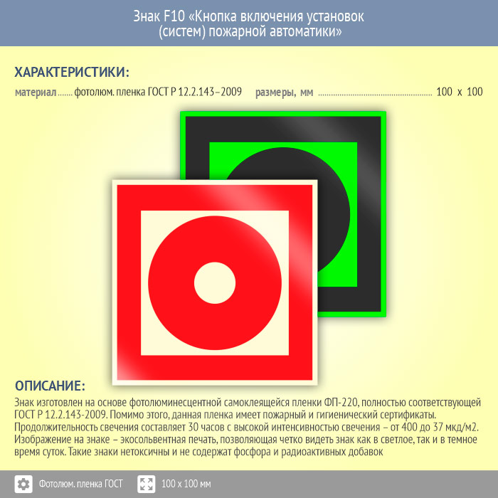 Знак F10 «Кнопка включения установок (систем) пожарной автоматики» (фотолюминесцентная пленка ГОСТ 34428-2018, 100х100 мм) в Верее купить