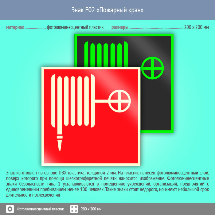 Знак F02 «Пожарный кран» (фотолюминесцентный пластик, 200х200 мм) в Верее купить