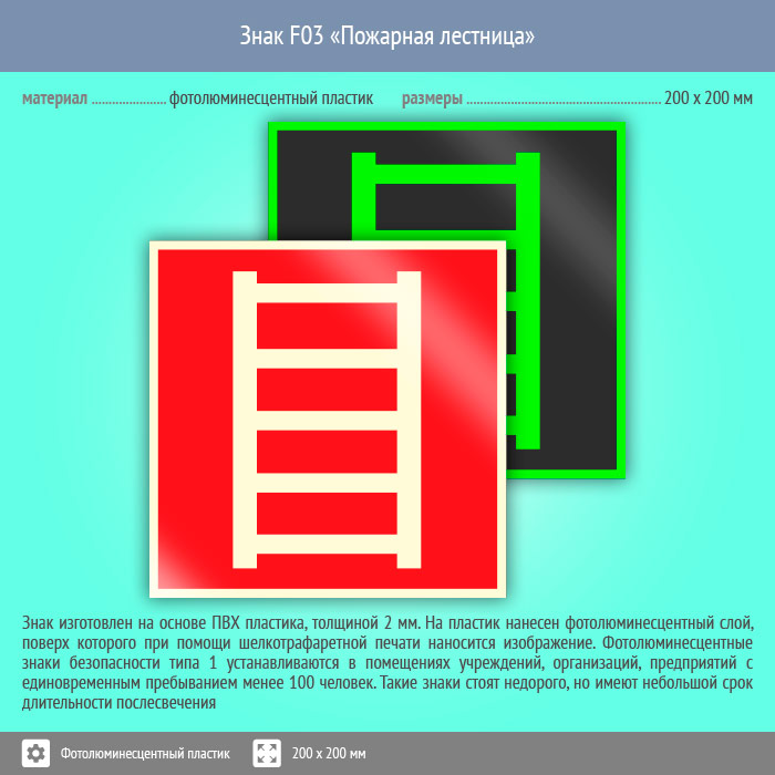 Знак F03 «Пожарная лестница» (фотолюминесцентный пластик, 200х200 мм) в Верее купить