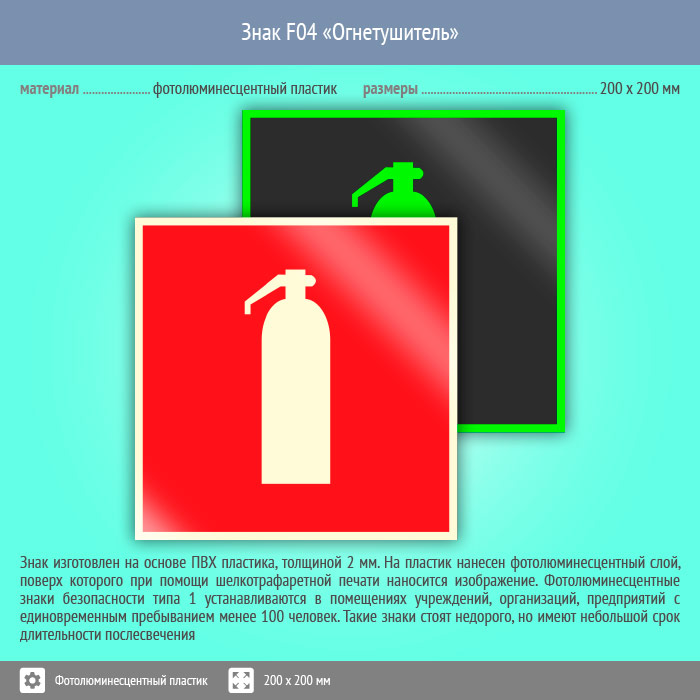 Знак F04 «Огнетушитель» (фотолюминесцентный пластик, 200х200 мм) в Верее купить