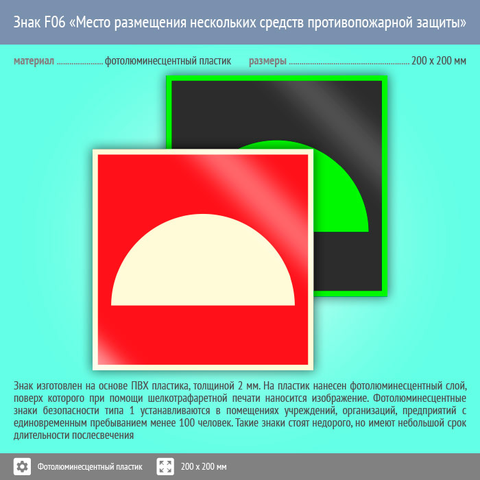Знак F06 «Место размещения нескольких средств противопожарной защиты» (фотолюминесцентный пластик, 200х200 мм) в Верее купить