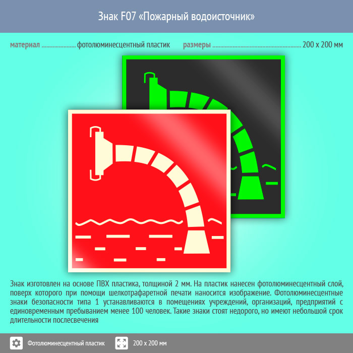 Знак F07 «Пожарный водоисточник» (фотолюминесцентный пластик, 200х200 мм) в Верее купить