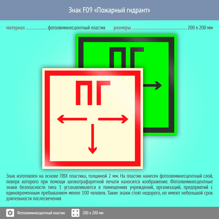 Знак F09 «Пожарный гидрант» (фотолюминесцентный пластик, 200х200 мм) в Верее купить