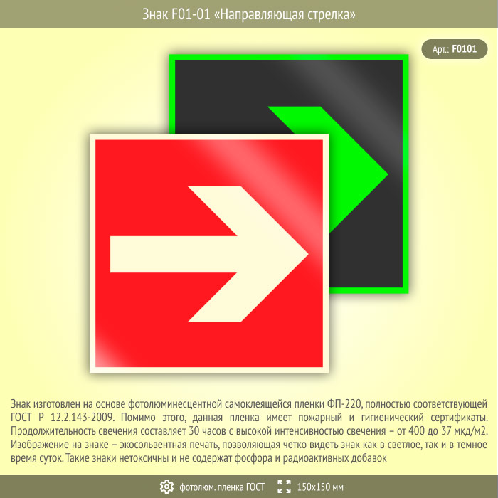 Знак F01-01 «Направляющая стрелка» (фотолюминесцентная пленка ГОСТ 34428-2018, 150х150 мм) в Верее купить