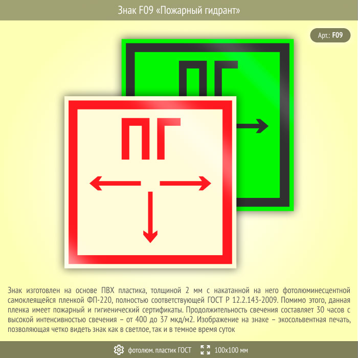 Знак F09 «Пожарный гидрант» (фотолюминесцентный пластик ГОСТ 34428-2018, 100х100 мм) в Верее купить