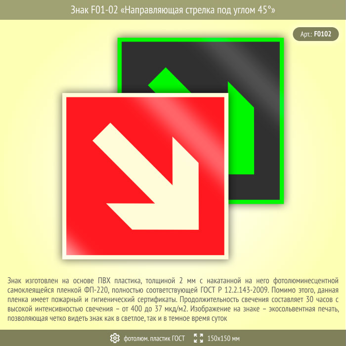 Знак F01-02 «Направляющая стрелка под углом 45°» (фотолюминесцентный пластик ГОСТ 34428-2018, 150х150 мм) в Верее купить