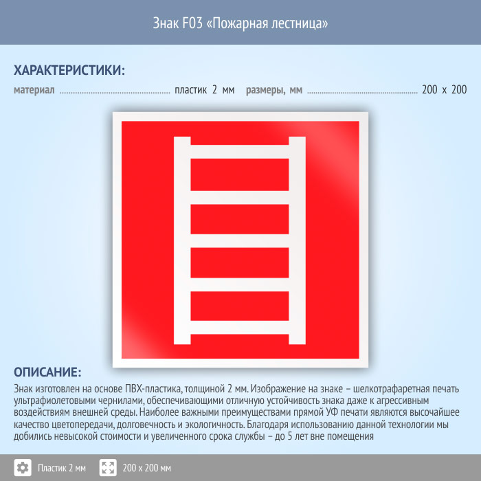 Знак F03 «Пожарная лестница» (пластик, 200х200 мм) в Верее купить