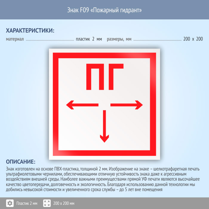 Знак F09 «Пожарный гидрант» (пластик, 200х200 мм) в Верее купить