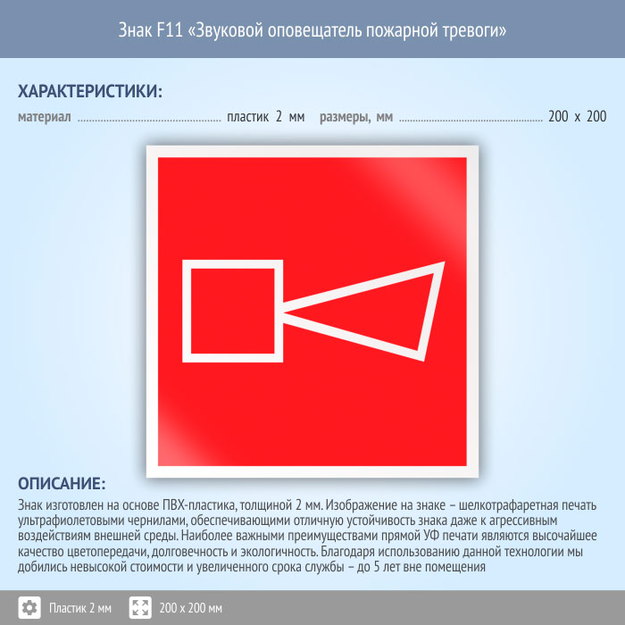 Знак F11 «Звуковой оповещатель пожарной тревоги» (пластик, 200х200 мм) в Верее купить