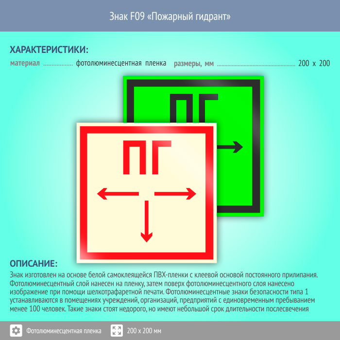 Знак F09 «Пожарный гидрант» (фотолюминесцентная пленка, 200х200 мм) в Верее купить