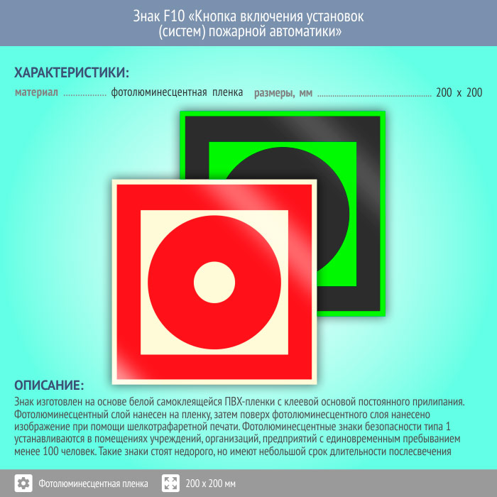 Знак F10 «Кнопка включения установок (систем) пожарной автоматики» (фотолюминесцентная пленка, 200х200 мм) в Верее купить