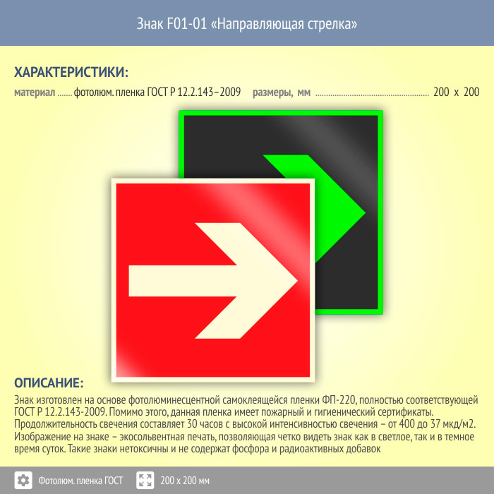 Знак F01-01 «Направляющая стрелка» (фотолюминесцентная пленка ГОСТ 34428-2018, 200х200 мм) в Верее купить