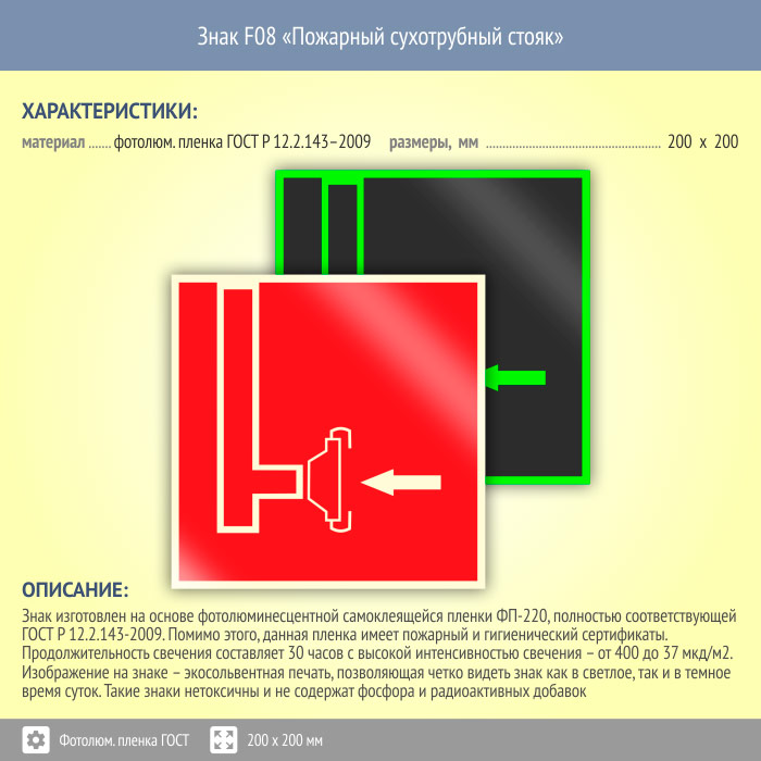Знак F08 «Пожарный сухотрубный стояк» (фотолюминесцентная пленка ГОСТ 34428-2018, 200х200 мм) в Верее купить