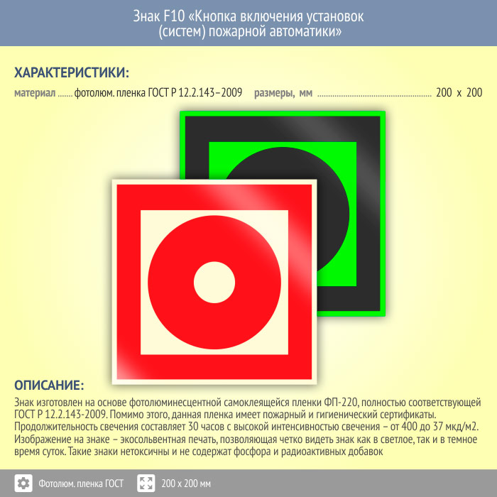 Знак F10 «Кнопка включения установок (систем) пожарной автоматики» (фотолюминесцентная пленка ГОСТ 34428-2018, 200х200 мм) в Верее купить
