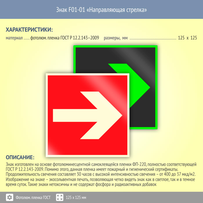 Знак F01-01 «Направляющая стрелка» (фотолюминесцентная пленка ГОСТ 34428-2018, 125х125 мм) в Верее купить