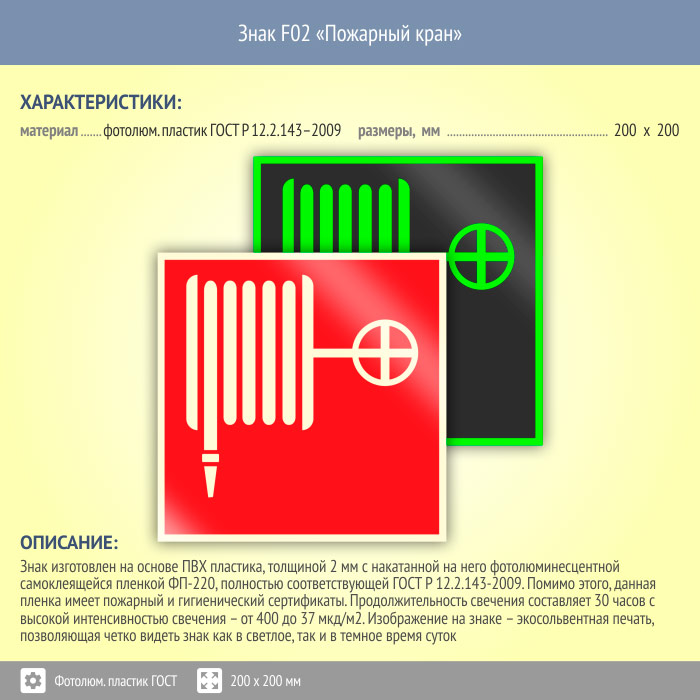 Знак F02 «Пожарный кран» (фотолюминесцентный пластик ГОСТ 34428-2018, 200х200 мм) в Верее купить