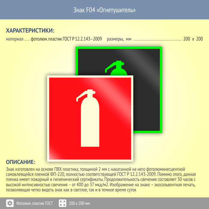 Знак F04 «Огнетушитель» (фотолюминесцентный пластик ГОСТ 34428-2018, 200х200 мм) в Верее купить