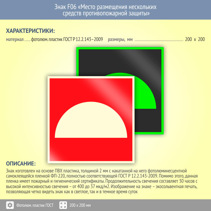 Знак F06 «Место размещения нескольких средств противопожарной защиты» (фотолюминесцентный пластик ГОСТ 34428-2018, 200х200 мм) в Верее купить