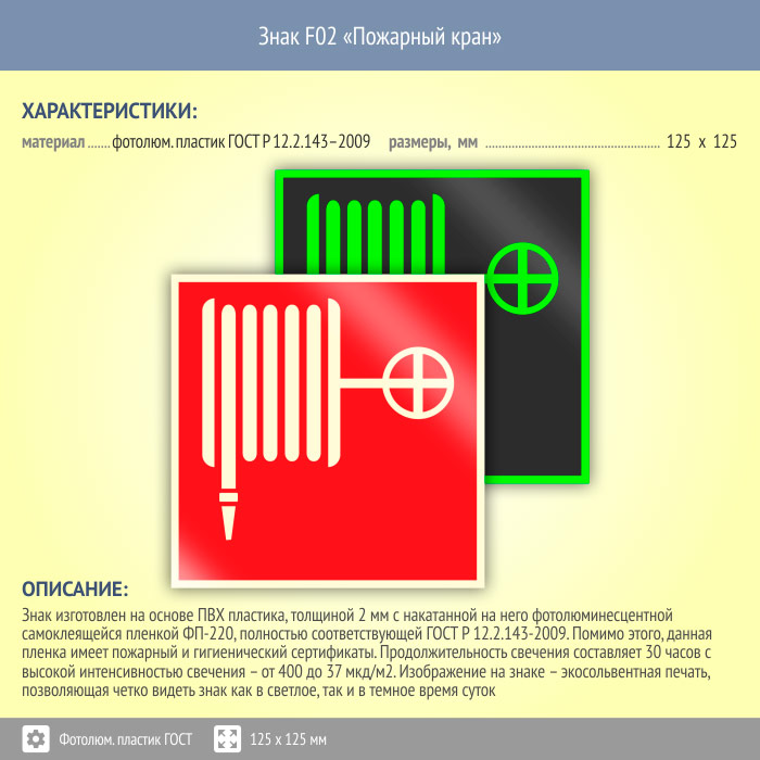 Знак F02 «Пожарный кран» (фотолюминесцентный пластик ГОСТ 34428-2018, 125х125 мм) в Верее купить