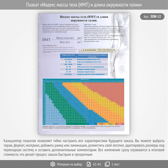 Плакат «Индекс массы тела (ИМТ) и длина окружности талии» (ЗОЖ-12, 1 лист) в Верее купить